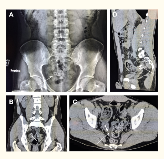 图1.腹部成像。(A)腹部平片。一个2.4×1.2 cm的长方形放射密度,其中两个透明区域位于骨正中线的正央。(B)腹部/骨盆CT。回肠远端可见2.4厘米的高密度。(C)腹部/骨盆CT,轴向切片。回肠远端可见2.4厘米的高密度。粪便充满扩张的回肠末端,右结肠增厚,相邻绞股。刚好在这个充满粪便的扩张性回肠末端附近发现了高密度。少量骨盆液(箭头)。(D)腹部/骨盆CT。回肠远端可见2.4厘米的高密度。回盲肠交界处增厚,右结肠增厚。