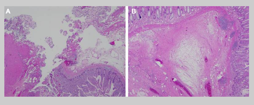 图3.狭窄回肠的组织病理。(A)肠壁中纤维蛋白沉积的缺损区域。(B)良性小肠组织,有粘膜下水肿和慢性炎症。未发现发育异常。