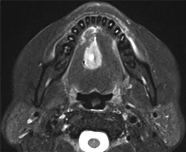 图2 MRI对T2加权图像进行轴位观察。MRI在T2加权像上表现为不均匀的高强度异质性病变。肿瘤贴附于右侧舌下腺。