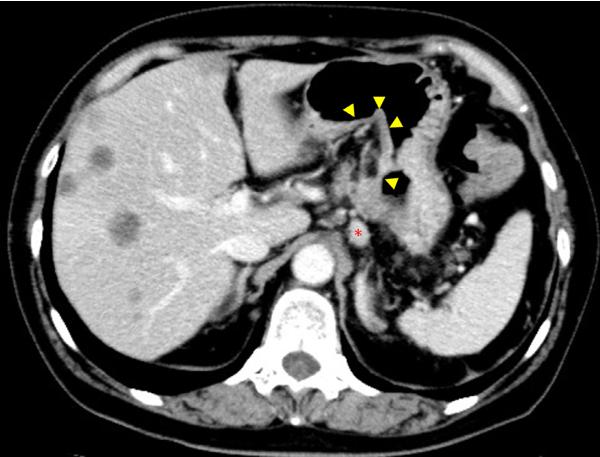 图4对比增强CT。增强CT显示胰腺体肿瘤。附着在胰腺肿瘤上的胃浆膜层被破坏,肿瘤侵入胃壁(黄色箭头)。胃左动脉淋巴结肿大(红色星号)。然而,胃的浆膜层大部分保持形状。