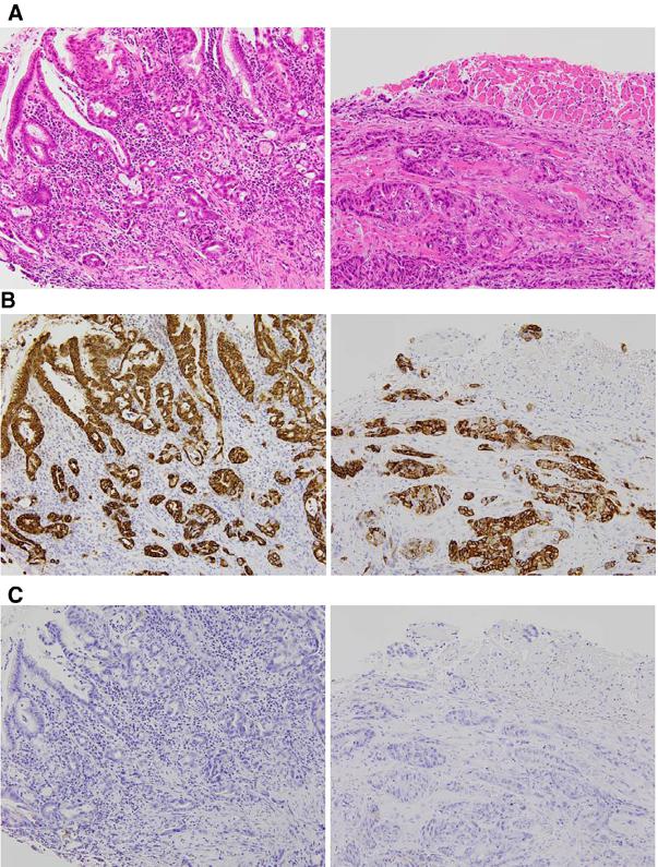 图5病理图像。(A)H&E染色。左:胃活检与腺癌的特征一致,腺癌由不同直径的小管、不规则的索和簇组成。腺癌从粘膜表面到粘膜肌层,主要在固有层。观察到具有印戒细胞成分的高分化至低分化管状腺癌(×200)。右图:舌活检标本的H&E染色显示腺癌主要由不规则的索和簇组成,偶见导管结构。腺癌侵犯了舌肌。中、低分化腺癌伴舌肌破坏(×200)。(B)MUC5AC染色。左:胃肿瘤细胞:非肿瘤性小凹上皮细胞均呈阳性(×200)。右:舌肿瘤:MUC5AC染色阳性(×200)。(C)MUC1染色图像(×200)。左:胃部肿瘤细胞和邻近的非肿瘤细胞MUC1(×200)呈阴性。右:舌肿瘤细胞MUC1(×200)呈阴性。