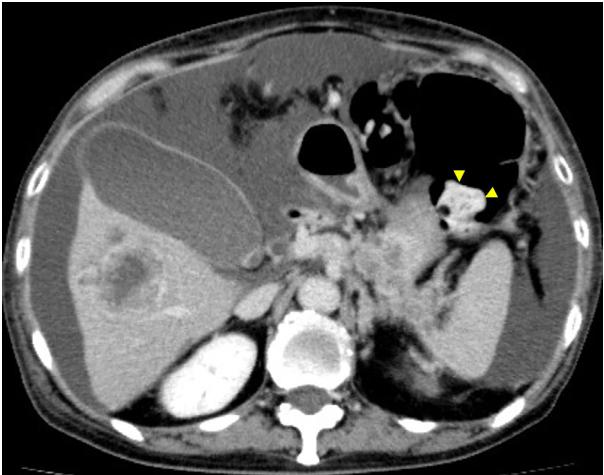图6 造影开始后6个月,增强CT轴位。胃肿瘤增大(黄色箭头)。