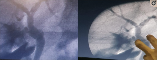 图2 术中进行了胆道造影,确认为双胆囊管解剖变异