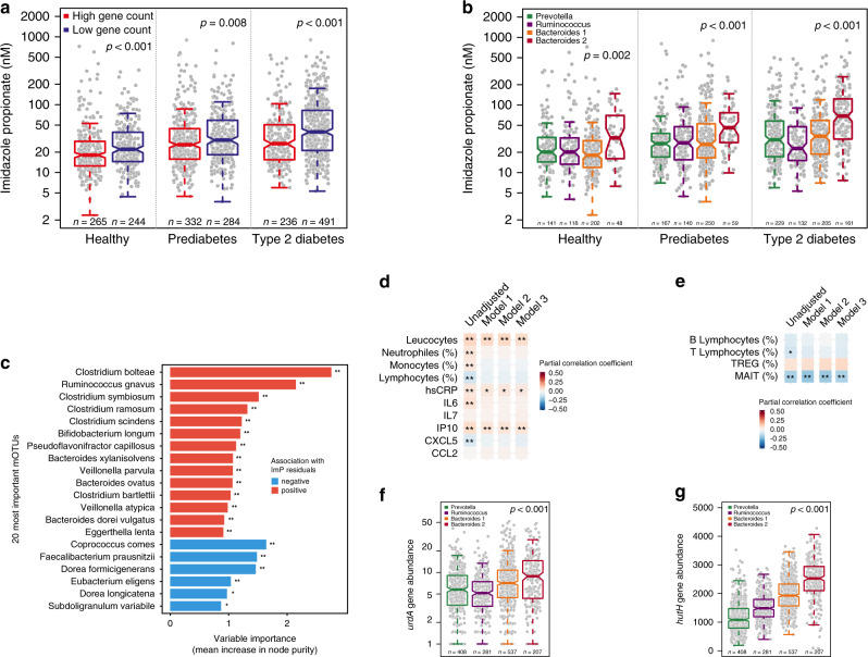 由于低微生物组基因计数与肥胖、胰岛素抵抗和血脂异常有关,我们接下来研究循环中ImP水平的增加是否与微生物组改变有关。因此,将研究人群分为高基因计数和低基因计数(阈值:607000个基因),观察到基因计数低的受试者与基因计数高的受试者相比,循环ImP水平更高,与糖尿病状态无关(图2a)。我们观察到ImP残差(根据年龄、性别、BMI、种族和肌酸清除率调整的ImP水平)和独立于糖尿病状态的基因计数之间存在显著的负相关。有趣的是,与糖尿病前期和健康受试者相比,2型糖尿病的影响范围更大(R = −0.31,P < 0.001)(补充图2a)。
