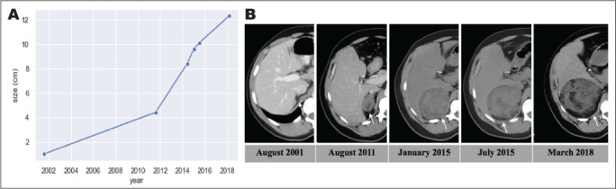 考虑到在随访期间肿块的体积显著增大,患者被安排进行手术,但未能进行随访。他在2018年再次来到我们的诊所,重新建立护理并讨论手术。