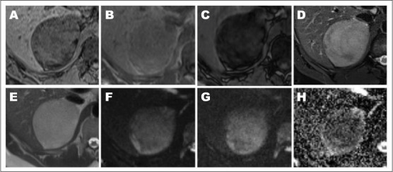 回顾以往针对不同临床指征进行的影像学研究,发现2001年和2011年右侧肾上腺肿物仅为1cm和4.4cm,在后续影像学研究中快速增长(图2)。2014年,无对比剂的腹部磁共振图像(评估肾功能不全)显示8.4 cm的右侧肾上腺肿物,呈T2信号,提示软组织信号强度。同相和反相T1图像和脂肪抑制序列分别证实了微观和宏观脂肪(图3)。2015年,无对比剂的计算机断层扫描(CT)显示进行性增大至9.6 cm和10.1 cm,可见大体脂肪。脾脏和骨性改变与已知的SCD一致。