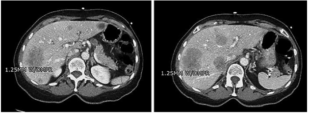 图1. 有/无静脉或口服造影剂的腹部和骨盆的CT检查显示肝转移灶