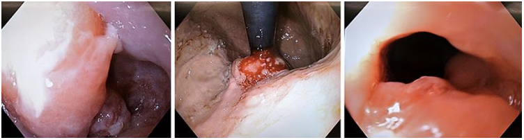 图2. 内镜检查发现食管远端有大肿块伴出血,肿块从远端食管延伸到胃