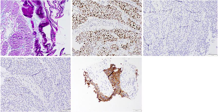 图3. 食管肿块100倍放大:阿尔辛蓝染色、CDX2染色、嗜铬粒蛋白染色、突触素染色,肝脏肿块100倍放大:CK7免疫组化染色