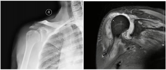 图2. 右肩MRI显示冈上肌腱撕裂(箭头)和巨大脓肿。