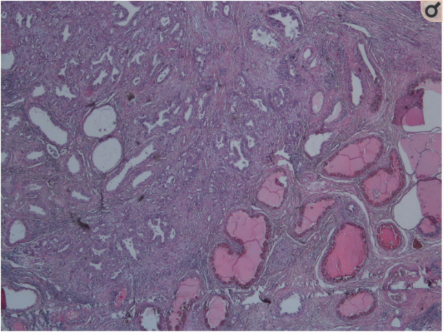 行胸腹部CT检查,提示直乙交接肿瘤狭窄,左侧结节性睾丸,如图1所示。睾丸超声提示左侧异位结节,睾丸鞘膜积液;结肠镜检查提示直肠肿瘤性梗阻。因患者出现腹膜炎体征,行急诊手术,术中见直乙交界肿瘤,横结肠肿瘤,左半肝肿瘤转移,行横结肠肿瘤切除术,结肠双腔造瘘,左侧睾丸切除,肝转移癌活检。术后病理提示结肠腺癌,肝脏病灶与结肠同源,睾丸病理未见睾丸实质,可见癌性增生,仅可见曲细精管结构,如图2。