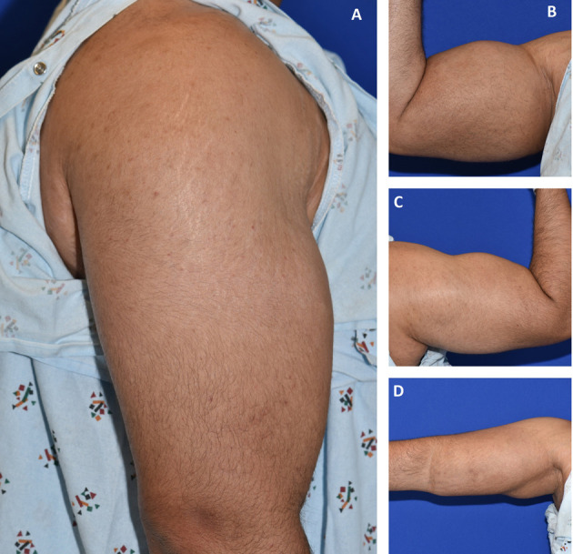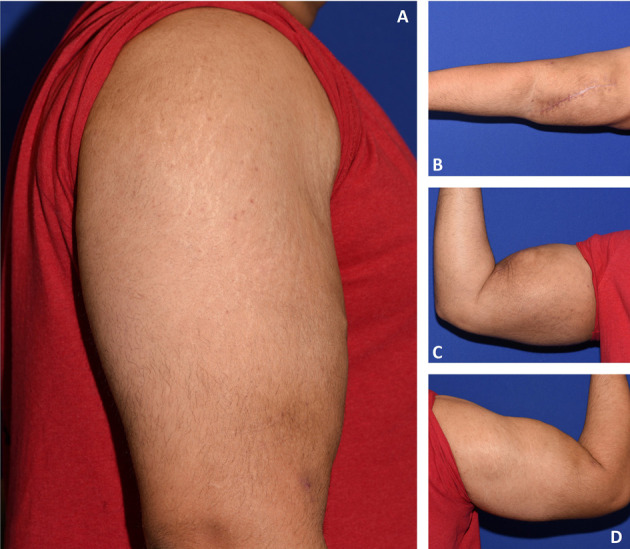 图5.手术后5周,同一位患者的术后照片。A,放松臂的背面。B,放松手臂的掌侧表面。C,屈臂的掌侧表面。C,屈臂的背侧表面