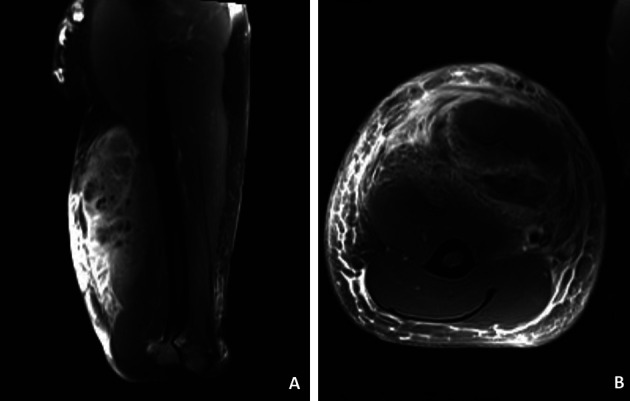 图2.磁共振成像表现为双侧肌肉组织前室和三角肌肌肉外侧均发生广泛的炎症变化,与肌炎,筋膜炎和蜂窝织炎相适应。脂肪或其他高脂质含量的异物可能与先前注入的异物有关,使前房和三角肌外侧肌组织扩散浸润。A,矢状面图像。B,冠状截面图像
