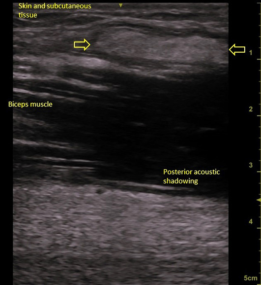 图3.使用线性探针以10 MHz的频率在长轴视图中对右前上肢同一患者的肌肉骨骼超声进行成像。黄色箭头指向受损的组织