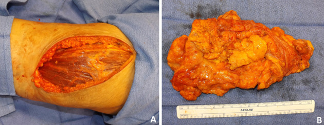 图4.手术切除了在二头肌中注射了合成油的患者的受损组织。A,去除受损组织后即刻手臂的图像。B,手术标本