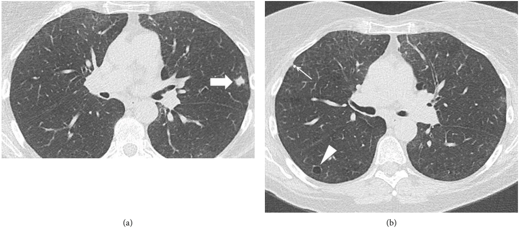 结节,1.1 cm,,边缘有毛刺(箭头),右下叶薄壁实质囊肿(箭头),右上叶一个微小的钙化结节(细箭头)。左上叶不规则形状图1. (a,b)胸部CT轴位图像显示