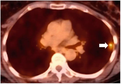 图2. 轴向,PET–CT图像显示左上叶结节FDG摄取增加,SUV为4.2(箭头)