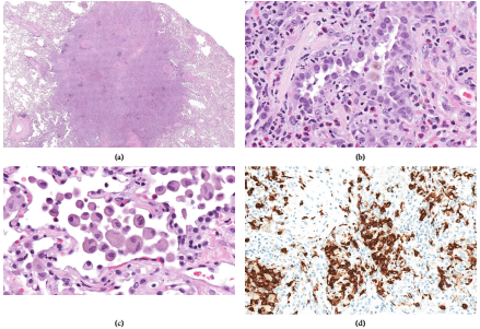 图3. 肺结节的组织学特征。(a)低倍图像显示一个实体结节,边缘模糊(苏木精-伊红染色,放大8倍)。(b)高倍镜下可见明显的反应性肺泡Ⅱ型细胞增生。肺泡间隔扩张并含有分散的嗜酸性粒细胞(苏木精-伊红染色,放大400倍)。(c)另一高倍镜显示肺泡巨噬细胞聚集在结节边缘(苏木精-伊红染色,放大400倍)。(d)免疫组化显示结节内有成簇的朗格汉斯细胞(放大400倍)