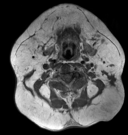本例患者是一位66岁的男性,近在两年多的时间里出现了颈枕部大量的软组织生长(图1)。他酗酒严重,但没有相关病史。体格检查显示前颈部(马德龙项圈)弥漫性增大,后颈部有三个巨大隆起。内分泌检查结果正常,实验室检查(包括血脂)未发现异常。术前进行磁共振成像(MRI)以区别于其他疾病,如病态肥胖症、神经纤维瘤病、库欣综合征和淋巴瘤(图2),结果显示颞部和枕部以及颈部I-III和V级和后颈部的对称性大量脂肪增生,这与MD的诊断一致。