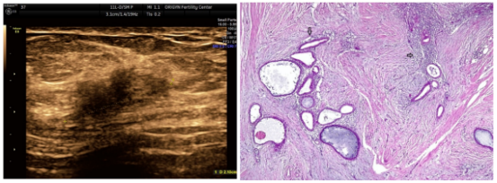 图2. 肿块的组织学显示出子宫内膜腺体和间质(箭头)