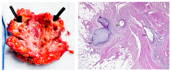 图4. 肿块的组织学表现为罕见的子宫内膜腺体和间质(箭头所示)嵌在结膜和脂肪组织内