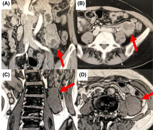 一名58岁的女性患者间歇性下腹部疼痛一周,腹部CT提示左侧腹膜后及左肾尾部5cm肿块,转入我院继续治疗。入院后患者血压147/101mmHg,心率63次/分,体温36.5℃,腹部平坦柔软,左侧腹部可触及拳头大小的肿块,质地坚硬,触之无痛。抽血结果回报,γ-谷氨酰转移酶升高60.4IU/L,全血细胞计数和血清肿瘤标记物正常。行胃镜及十二指肠镜检查,结肠镜检查,未见明显病变。