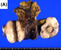 图3 切除的标本大小为7*4.5*3cm肿瘤,位于降结肠系膜间,切面呈白色,可见坏死区域