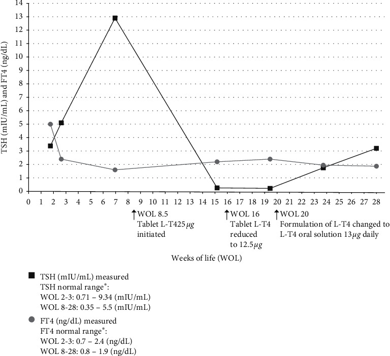 在16个月时,生物素停用4天,复查甲状腺功能测试显示TSH被抑制,FT4轻微升高。将L-T4的剂量降低至12.5µg(半片),并在20周时,停用生物素4天再次复查甲状腺,测试显示TSH抑制和FT4升高。父母仍然报告切割和压碎L-T4片剂有困难,导致剂量不一致。