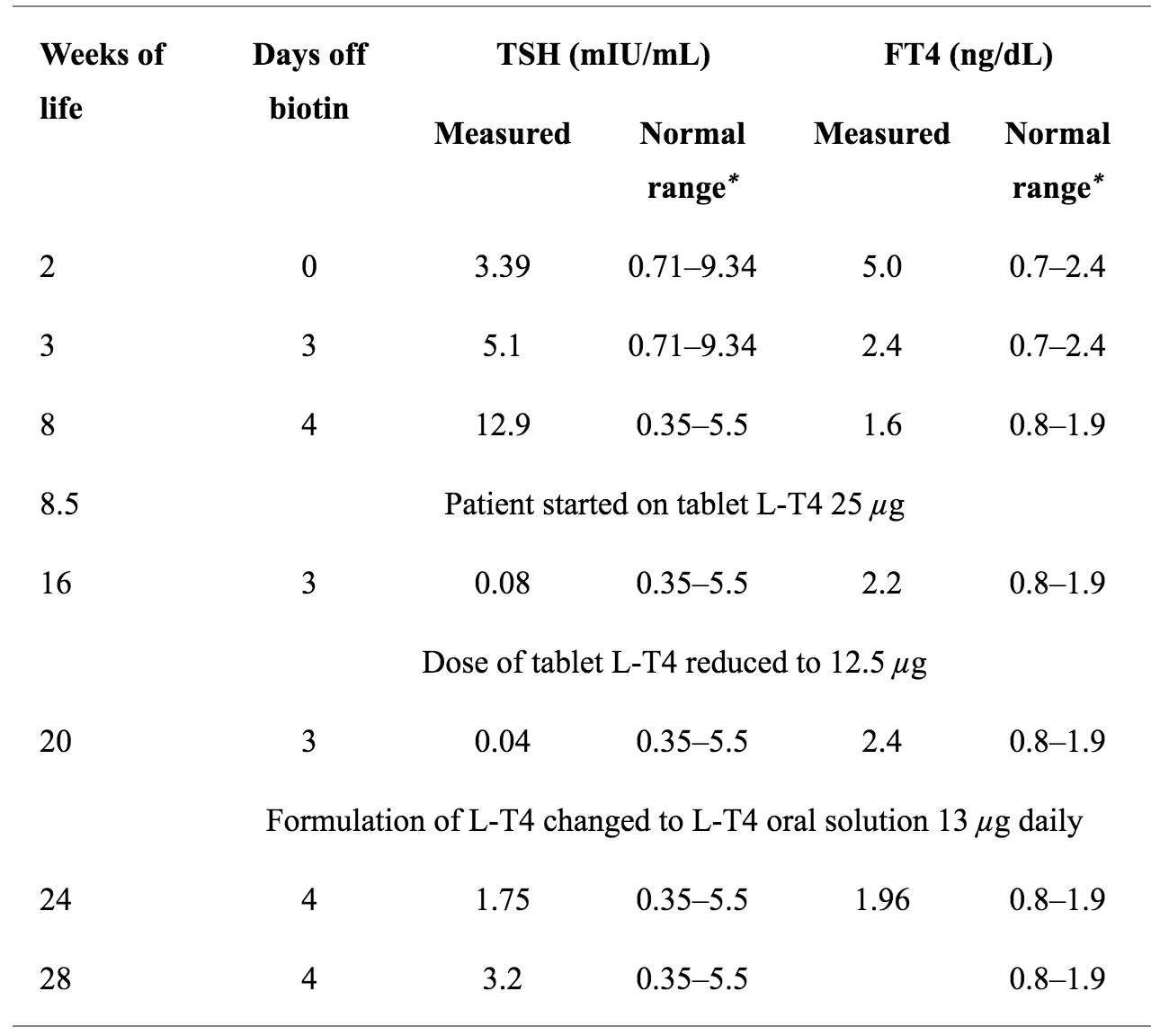 在出生后8周时,停用生物素4天,TSH升高,FT4保持在参考范围内。当时诊断为先天性甲状腺功能减退症,儿童开始服用L-T4 片剂25µg。患者父母报告,难以通过一瓶配方奶粉中的压碎片剂给药。