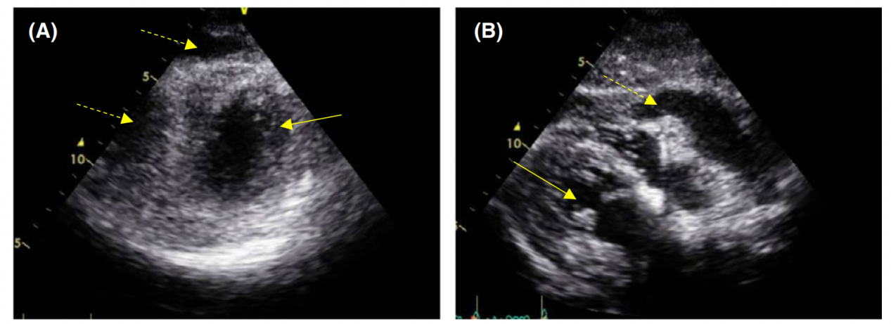 图1: 超声心动图在入学。A,左室短轴图像显示因心脏填塞导致右心室充盈受损。B,左心室长轴图像显示大量心包积液。←,表示左心室;⇠,显示心包积液