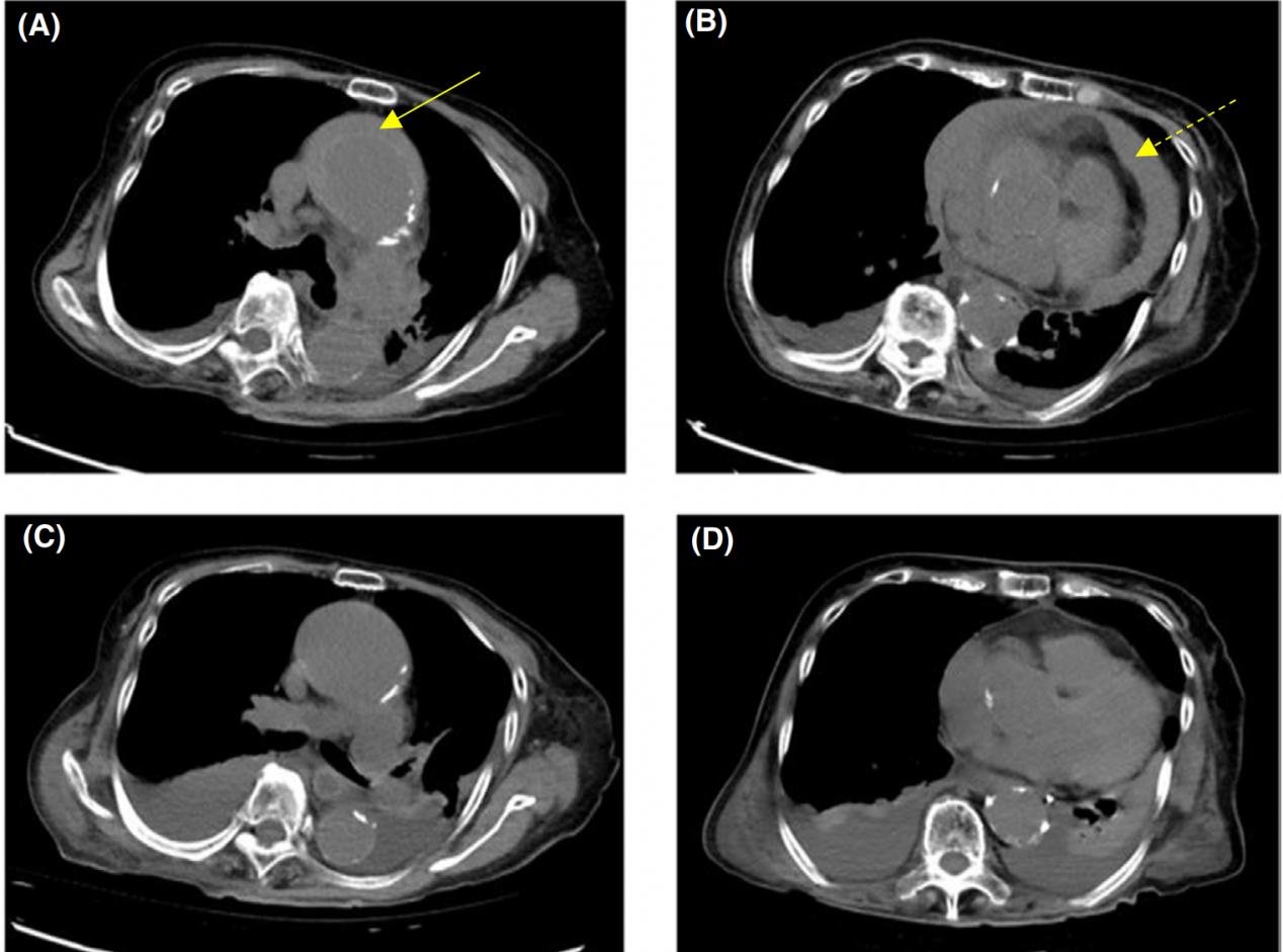 图2: 非收缩胸部计算机断层扫描(CT)。A, B,入院时胸部CT显示一个充满血肿的假腔,呈新月形,主动脉壁后呈高衰减区(新月形高衰减血肿),降主动脉水平有心包积液。C, D,入院后第8天胸部CT示升主动脉周围血肿吸收,心包积液减少。←,表示高衰减血肿;⇠,显示心包积液