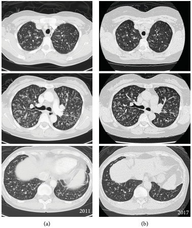图1. LIP的初次扫描(a)和6年后(b)的选定轴向CT图像