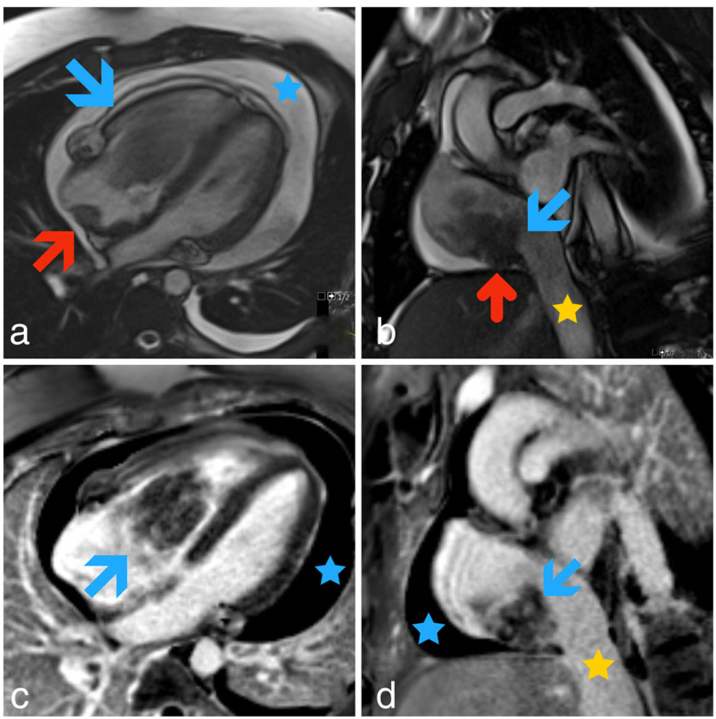 图1:(a)四室平衡稳态自由进动(bSSFP)心脏MRI图像显示一个位于右心房的巨大叶状肿块脱垂至右心室(蓝色箭头)。右心房后壁附着也显示出来(红色箭头)。(b)通过右心房基底的相应短轴bSSFP图像清楚显示肿块的下附着(蓝色箭头)以及向心包间隙的微小延伸(红色箭头)。(c和d)四室和两室相敏倒置恢复(PSIR)延迟增强显示肿瘤病灶(蓝色箭头)内的不均匀增强。黄色星号表示下腔静脉,蓝色箭头表示心包积液
