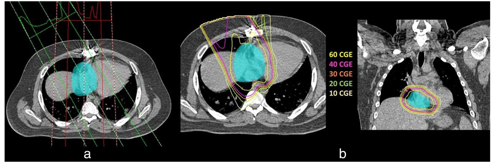 患者接受紧急手术切除,病理示上皮样血管肉瘤。免疫过氧化物酶染色显示肿瘤细胞CD31、CD34、ERG阳性,D2-440、HHV-8、细胞角蛋白AE1/AE3阴性。肿瘤大小10.5×6×4cmin,镜下见阳性边缘(R1切除)。术后两周行PET-CT扫描未发现任何远处转移。单纯切除以获得阴性切缘是不可行的,患者接受PBT联合紫杉醇治疗(每周80 mg/m2,共7个周期)。PBT的计划包括获得一个有或没有静脉造影剂的四维(4-D)CT模拟。心脏MRI检查后确定了具有临床目标量(CTV)风险的区域。 根据来自4-D CT模拟的图像,内部目标体积(ITV)为5毫米,用于扩展CTV以进行质子计划(图2)。