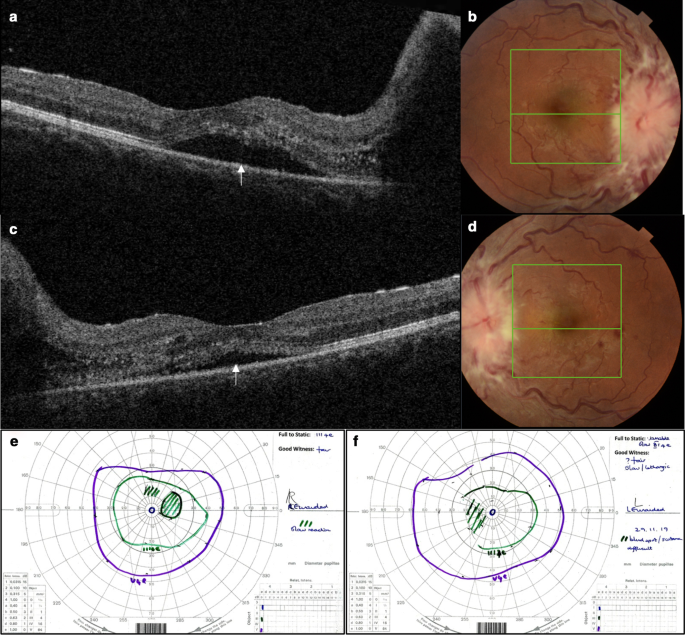 图1. 初始光学相干断层扫描(OCT)显示乳头周围和黄斑视网膜下液体(白色箭头)。彩色眼底照片(b右;d左)突出显示OCT图像的行扫描位置(a右;c左)。最初的Goldmann视野图(e右;(左)显示狭窄的视野和扩大的左侧盲点
