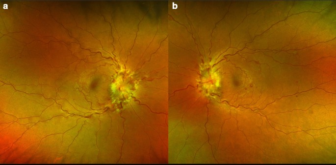 图2. 光学超广域成像显示的严重视乳头水肿。a.右眼;b.左眼