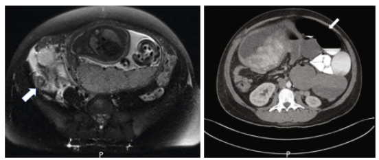 图1. 在T2加权MRI上发现急性阑尾炎。右下象限阑尾扩张(箭头),周围有炎症改变
