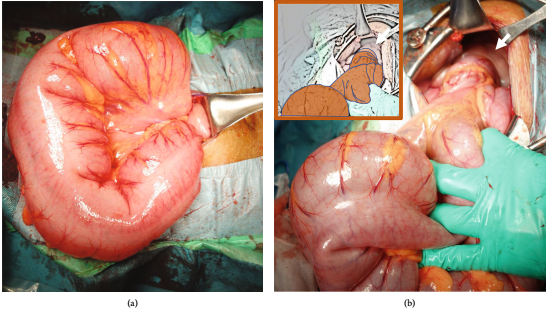 血气分析显示乳酸水平升高提示肠缺血。由于肠扭转的部位位于子宫的背侧,遂决定进行剖宫产术,以确保分娩后肠切除的手术区域。剖腹产成功分娩一男婴,体重1840 g,Apgar评分8/8。乙状结肠长约80 cm,高度活动。结肠360度顺时针旋转,未观察到肠缺血或坏死(图3(a)和3(b))。扭转复位后,乙状结肠固定在腹膜左侧。产妇术后病程平缓,7天后出院。婴儿在新生儿重症监护室接受护理,出院时无任何后遗症。