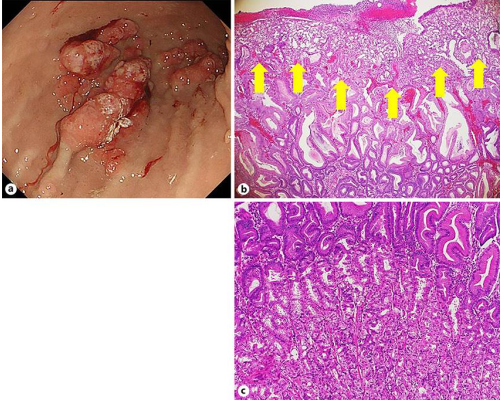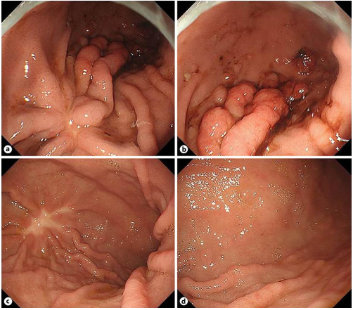对主要的胃息肉进行了EMR,并对其进行了随访。切除息肉的病理结果显示隐窝增生伴固有层水肿,表面上皮的血管内有明显的扩张(图2b)。此外,在增生性息肉中,胃底腺囊性扩张,壁细胞明显增生(图2c)。