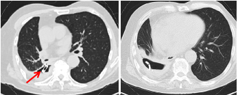 图3. 术后5个月的胸部CT扫描显示成功地用Amplatzer装置(箭头)和带蒂肌瓣封堵了BPF和脓胸腔