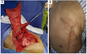 图2. 手术和术后图像。(A) 带蒂背阔肌和前锯肌瓣。(B) 胸部切口愈合良好