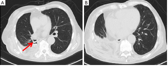 图1. 术前胸部CT扫描显示一个9 cm×7 cm×6 cm的脓胸腔,内有胸腔积液,右下胸有导管和支气管支架(箭头)