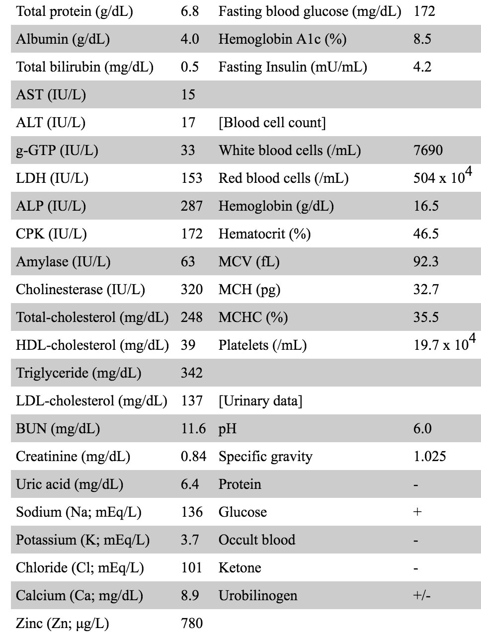 2020年12月,一名51岁的非肥胖日本男子因年度健康筛查(空腹血糖;164mg/dL,糖化血红蛋白(HbA1c);8.8%)怀疑患有2型糖尿病伴高血糖症而被送往日本熊本市金诺智医院糖尿病护理中心。三年前,一次健康检查(空腹血糖;140毫克/分升,糖化血红蛋白;7.6%)指出他在禁食状态下出现高血糖,但未进一步就诊,因为没有任何症状,也没有意识到自己疾病的严重性。患者是上班族,无过量摄入软饮料的习惯,饮食不均衡导致缺锌。有吸烟史(每天10支烟)及饮酒史(每天30克酒精),无积极锻炼的习惯。否认家族史糖尿病、心血管疾病,及任何习惯性药物。