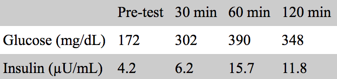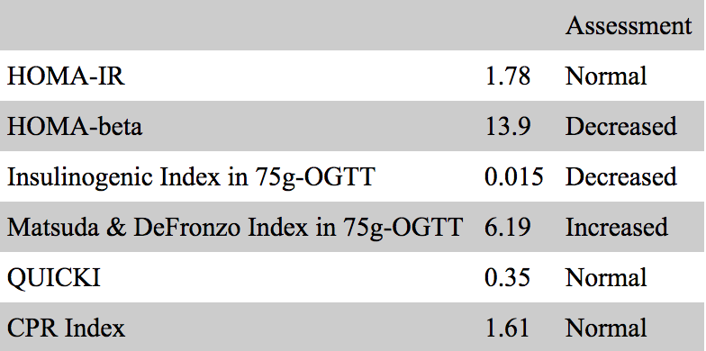 患者没有糖尿病视网膜病变、神经病变、肾病、甲状腺功能障碍或肾上腺异常。不肥胖,通过生物电阻抗分析仪和腹部计算机断层扫描(表2)评估,没有多余脂肪堆积的证据。进行75g口服葡萄糖耐量试验(75g OGTT),发现基础胰岛素分泌维持良好,无高胰岛素血症,长时间高血糖,胰岛素升高对葡萄糖负荷反应差(表3)。