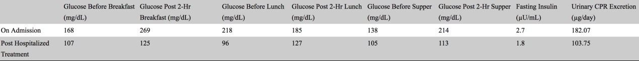 根据75g OGTT的血胰岛素水平结果,推测胰腺β细胞功能障碍可能是其糖尿病的主要致病原因(表3)。患者第一次就诊三周后,被送进医院接受高血糖症的评估和治疗。检查发现患者对谷氨酸脱羧酶的抗体滴度无法检测(<5.0 U/mL),尿C肽免疫反应(CPR)排泄量意外地加速到182.07µg/天,从而确定了T2DM(表4)。