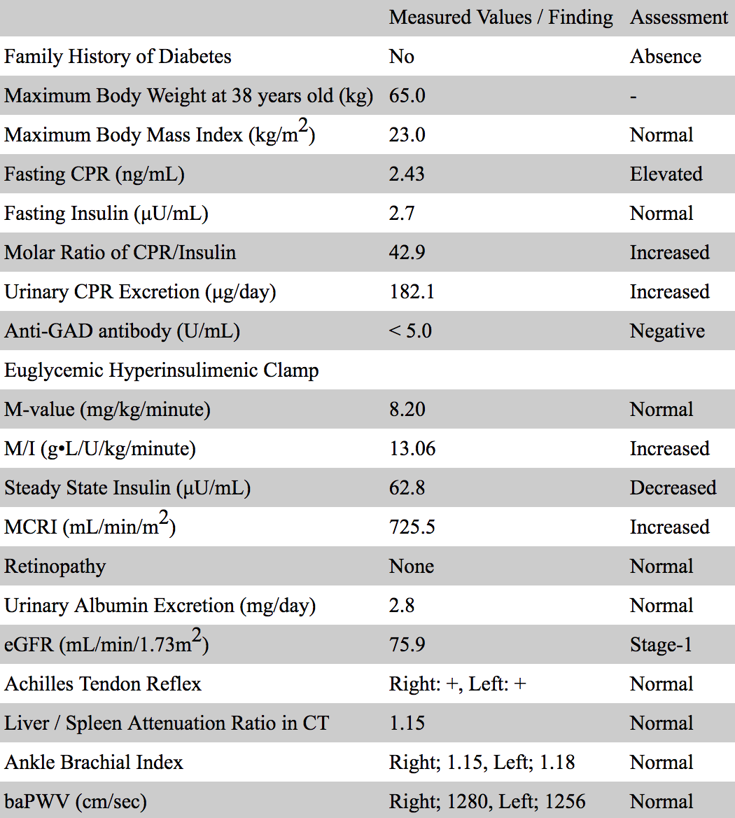 通过空腹条件下CPR/胰岛素的摩尔比评估肝脏胰岛素清除率显著增加(表6)。腹部计算机断层扫描显示正常的皮下和腹部脂肪沉积和正常的肝脏脂肪堆积(表6)。其糖代谢异常的病理状态提示胰岛素清除率升高可能导致胰岛素作用减弱,但胰腺β细胞功能障碍和胰岛素抵抗均不存在。