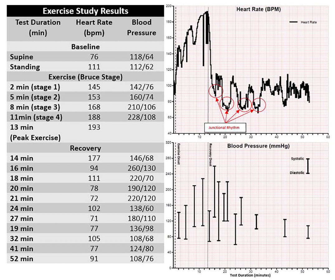 图2: 运动研究结果以表格形式记录在测试期间的心率和血压,旁边是相同的测量结果曲线图。红圈表示连接节律,是心率处于连接状态时的恢复时间