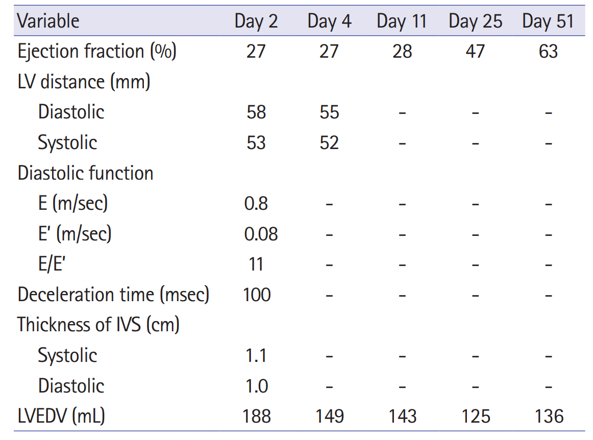 患者被收住在心脏病科的重症监护室,接受了气管切开术、机械通气和额外的治疗。治疗后,超声心动图显示LVEF从27%改善到47%,心电图显示窦性心律正常。