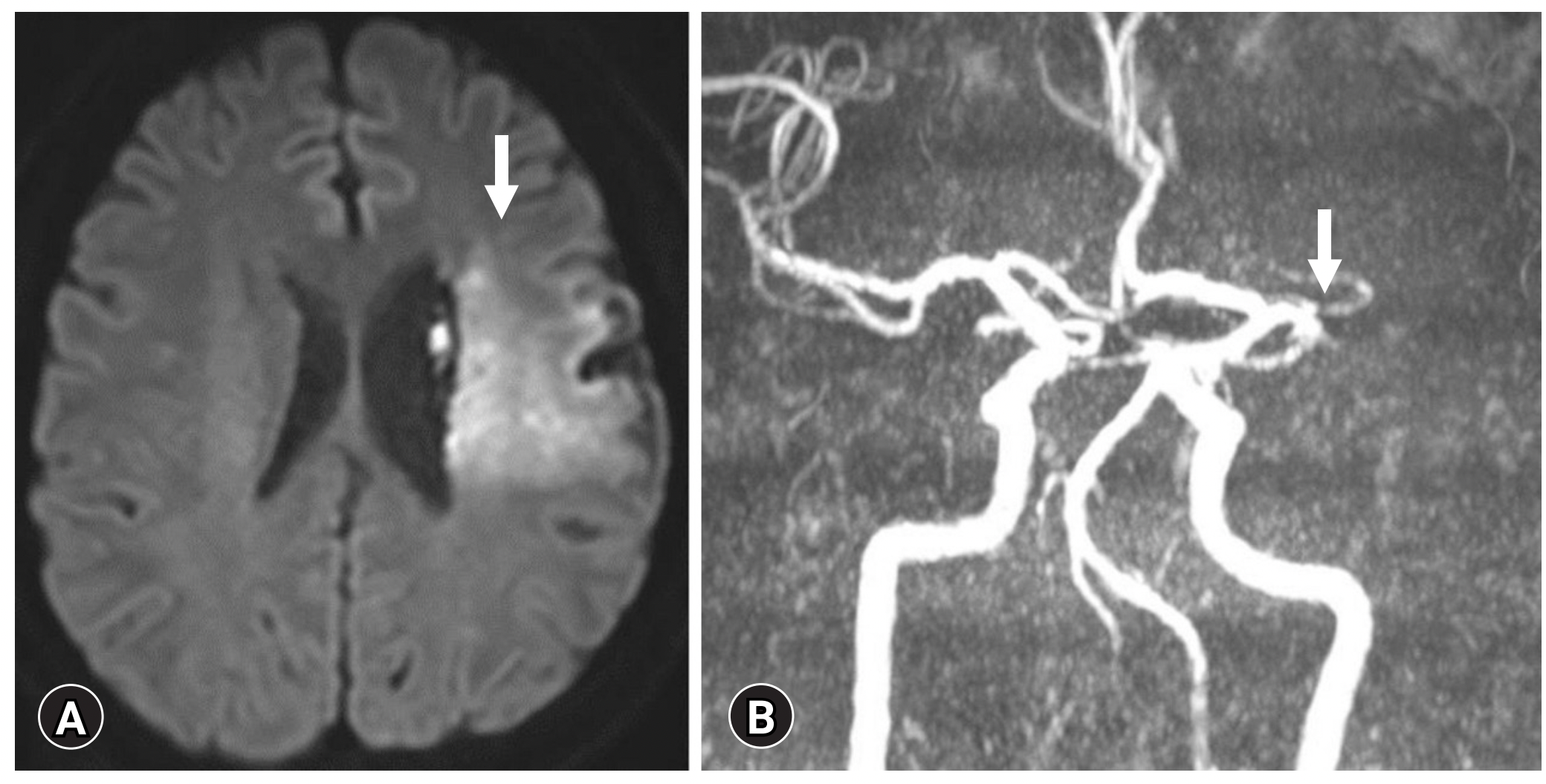 图1: (A)脑磁共振成像显示左侧大脑中动脉区域梗死(箭头)(弥散加权图像,轴位视图)。(B)脑磁共振血管造影显示左侧大脑中动脉M1段闭塞(箭头)