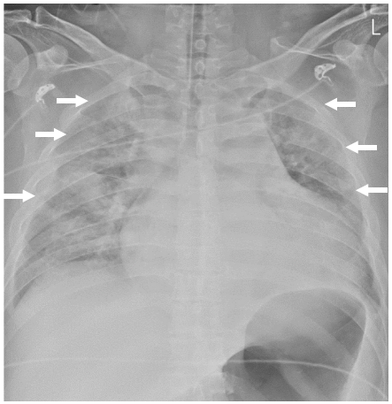 图2: 胸部x线显示肺水肿,胸腔积液,和轻微的心脏扩大(箭头)